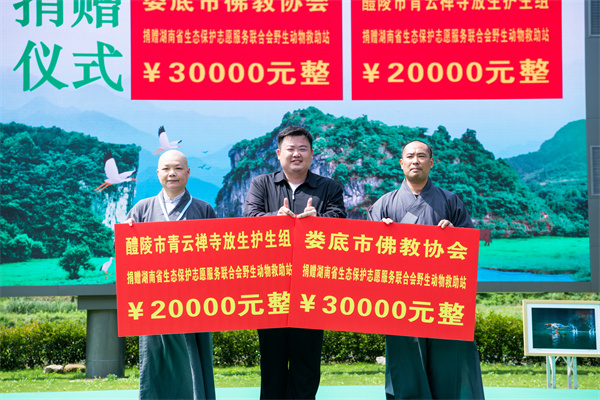 在活动现场还举行了湖南省佛慈基金会向湖南省生态保护志愿服务联合会捐赠30万元、娄底市佛教协会捐款3万元、醴陵市青云禅寺放生护生组捐款2万元用于开展护鸟营项目捐赠仪式。加强湄江禁渔后水生生物资源保护和水域生态修复,启动仪式结束后,与会领导嘉宾共同放流了40万尾鱼苗。