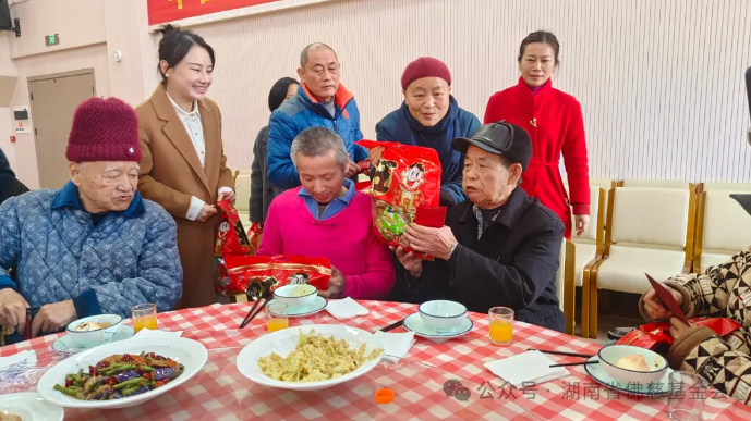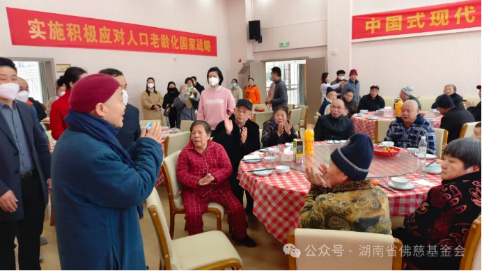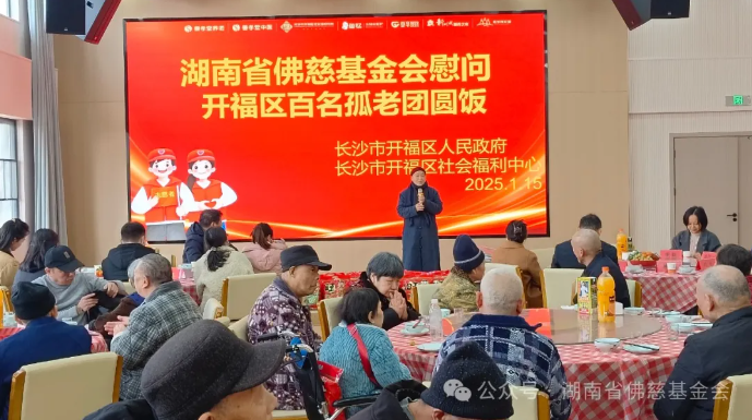 告别开福寺社区后,能净大和尚又马不停蹄地驱车前往开福区社会福利中心。福利中心里住着五十几位孤寡老人和五保户老人,这些老人大多无依无靠,在岁月的长河中独自前行。能净大和尚走进福利中心,热情地与老人们打招呼,那亲切的模样就像他们久未谋面的亲人。她陪着老人们散步聊天,耐心倾听他们讲述过去的故事。到了中餐时间,能净大和尚与老人们一同围坐在餐桌前,共进中餐。能净大和尚为老人们送上了新年祝福,希望在党和政府的悉心关怀下,老人们能够健康快乐、开开心心地过好每一天,以饱满的精神迎接2025年的农历新年。最后,能净大和尚将精心准备的新年红包和大礼包一一送到老人们手中,老人们接过礼物,脸上洋溢着幸福的笑容,眼中闪烁着感动的泪花,纷纷对能净大和尚的善举表示感谢。