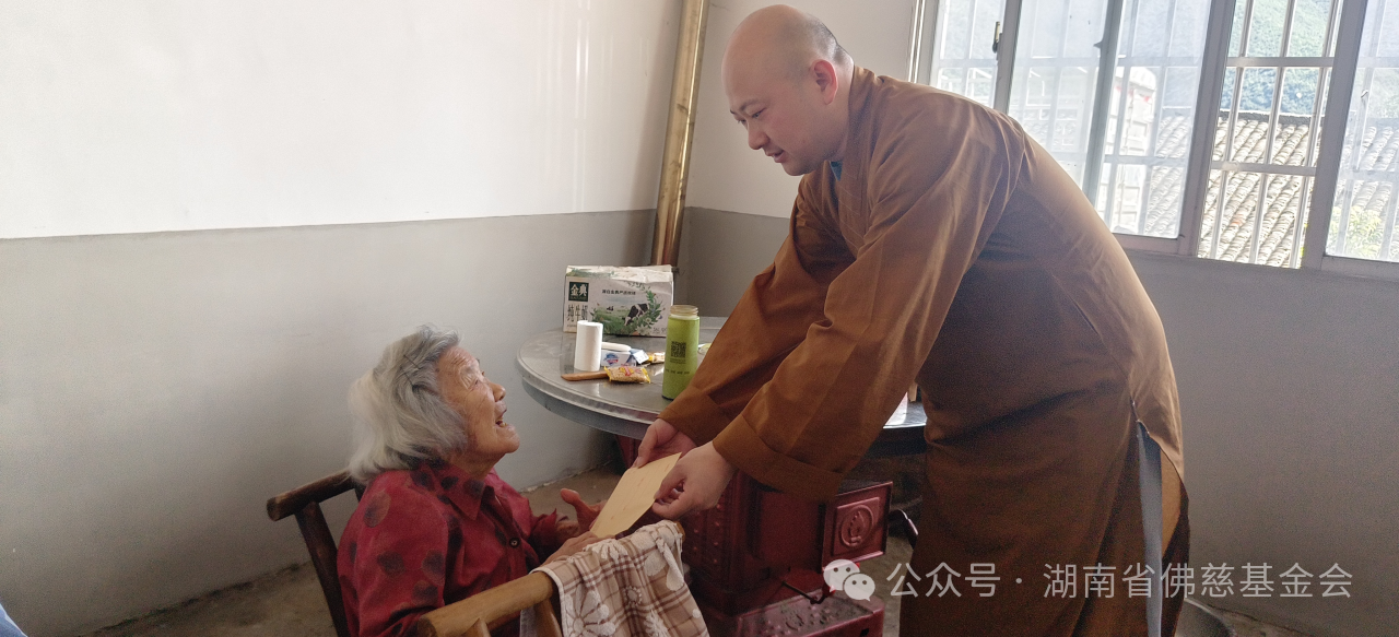 随后,基金会深入到受灾最为严重的村民家中。眼前的景象令人痛心不已,房屋几乎全部垮塌,生活的痕迹被灾难无情地抹去。从村民的讲述中得知,好在救助及时,否则95岁的奶奶可能会遭遇不测。湖南省佛慈基金会常务副理事长兼秘书长永兴大和尚听闻后,特意来到奶奶身边慰问,并送上慰问大红包。他亲切地与奶奶交谈,那温暖的话语如同春风拂面:“奶奶,您别担心,有政府和大家的帮助,日子一定会好起来的。希望您能开开心心、健健康康的。”奶奶布满皱纹的脸上露出了感激的笑容,那笑容里,有对当下关怀的感动,更有对未来生活的希望。这简单的互动,却充满了无尽的温情,诠释着慈善的力量与意义。