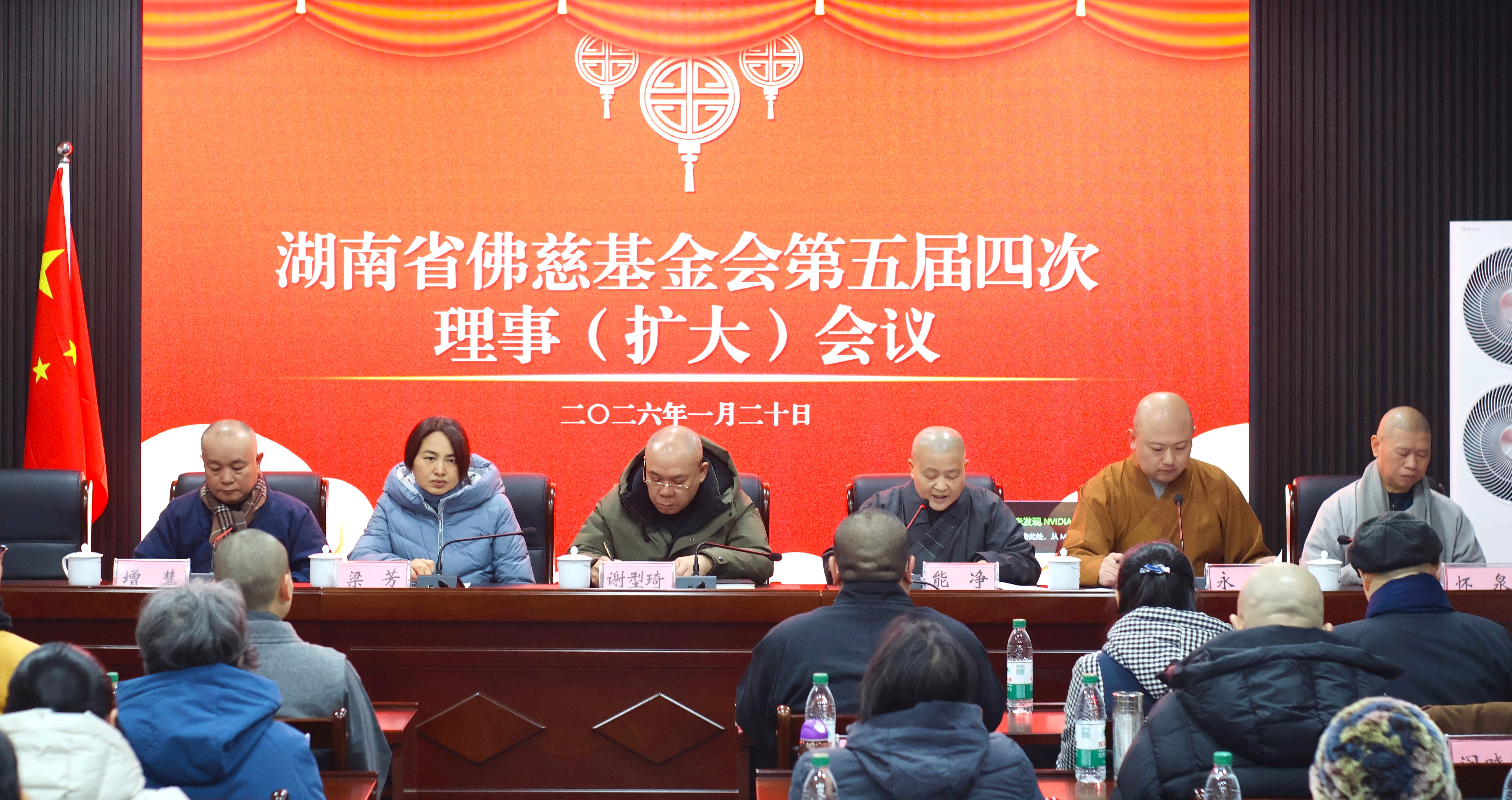 2026年1月20日上午,湖南省佛慈基金会第五届四次理事(扩大)会议在长沙龙门里顺利召开。湖南省民宗委宗教二处处长谢型琦、省民宗委宗教二处一级调研员梁芳、湖南省佛慈基金会理事长能净大和尚、常务副理事长兼秘书长永兴大和尚、副理事长怀泉大和尚、副理事长罗丽芬、副理事长杨雅婷、基金会全体理事及监事会成员、组长等100余人出席会议。