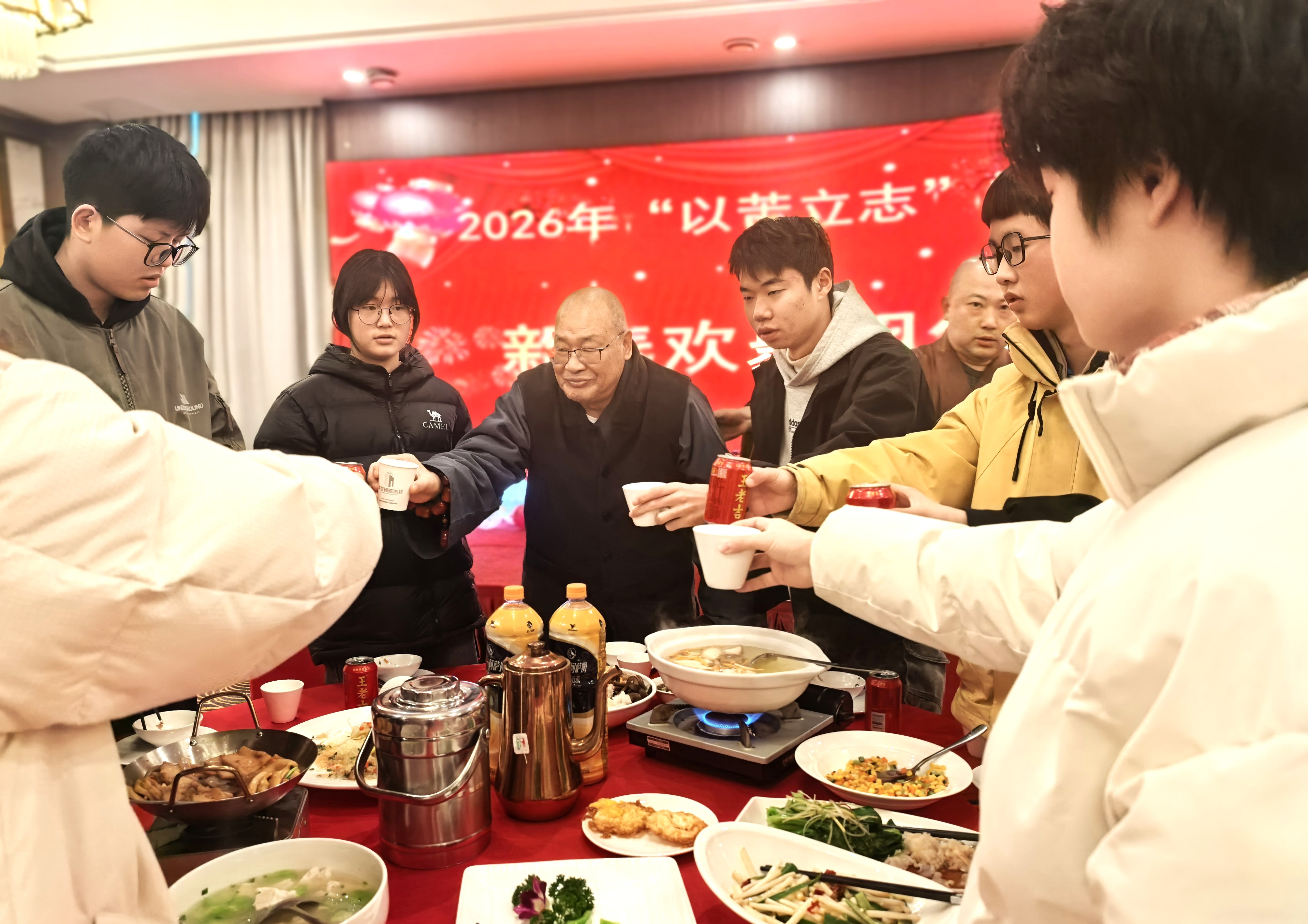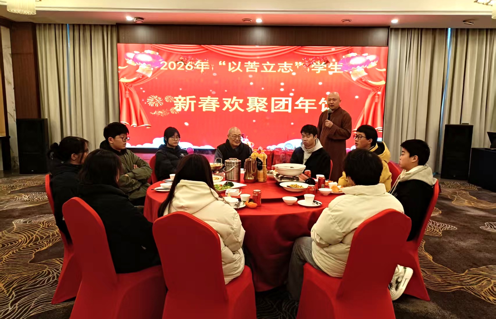 2026年2月10日,恰逢农历腊月二十三小年,年味渐浓、暖意氤氲。湘潭润丰酒店内灯火通明、欢声阵阵,由湖南省佛慈基金会名誉理事长圣辉长老资助的困境学子们欢聚一堂,共赴一场温情的春节团年饭,在欢声笑语中感受社会大家庭的温暖,提前共度新春佳节。受湖南省佛慈基金会现任理事长能净大和尚委托,湖南省佛慈基金会常务副理事长兼秘书长永兴大和尚及爱心人士一同出席。
