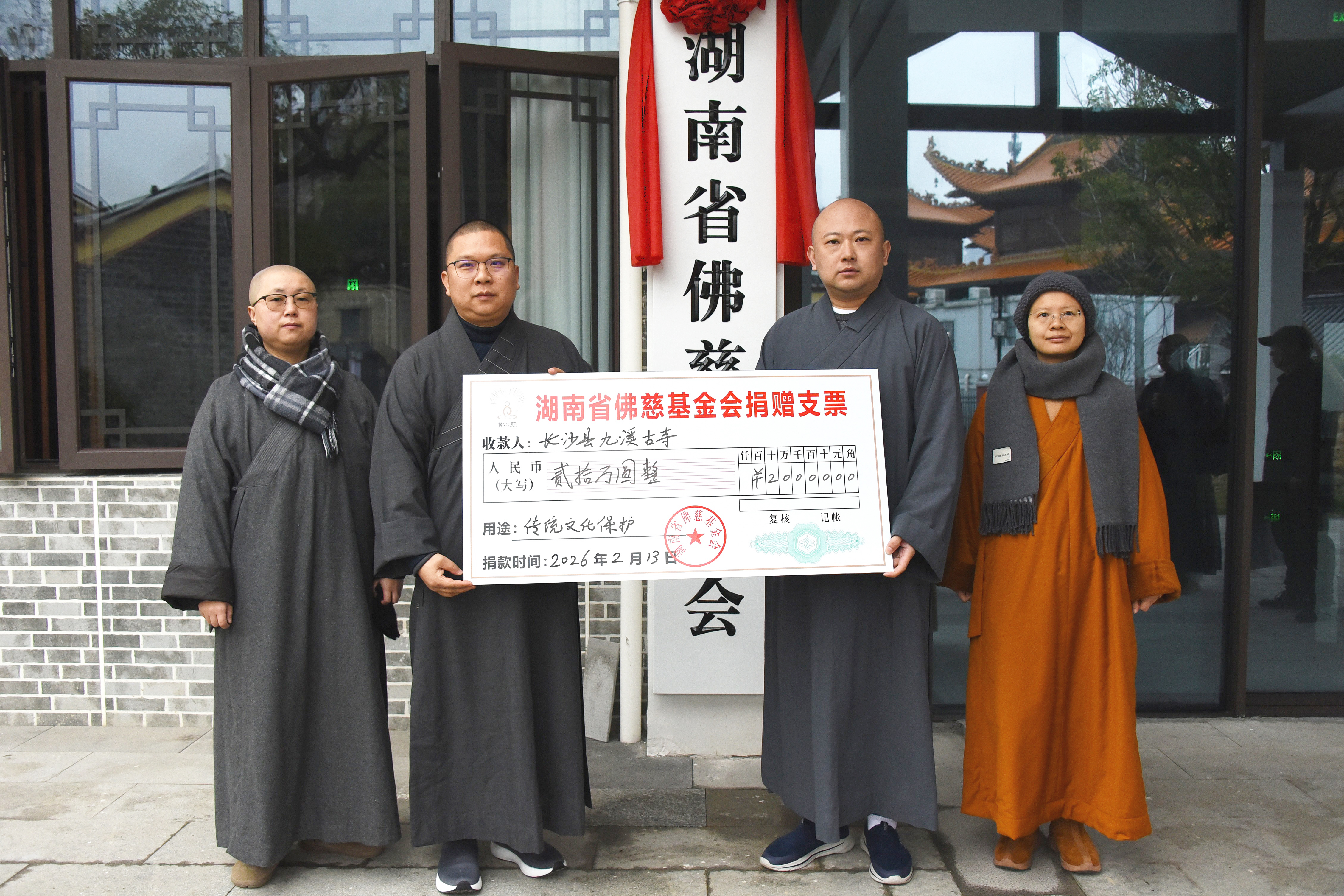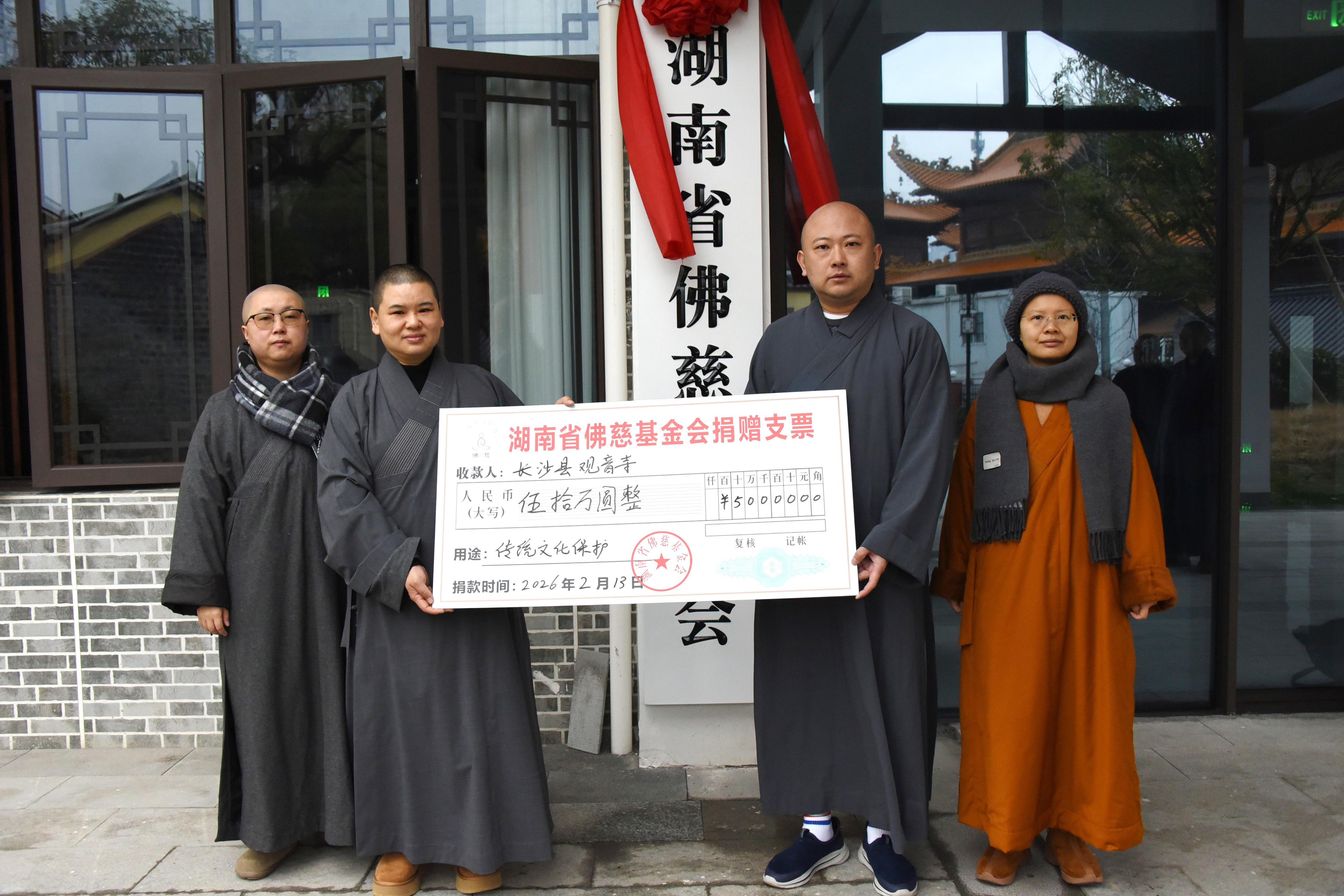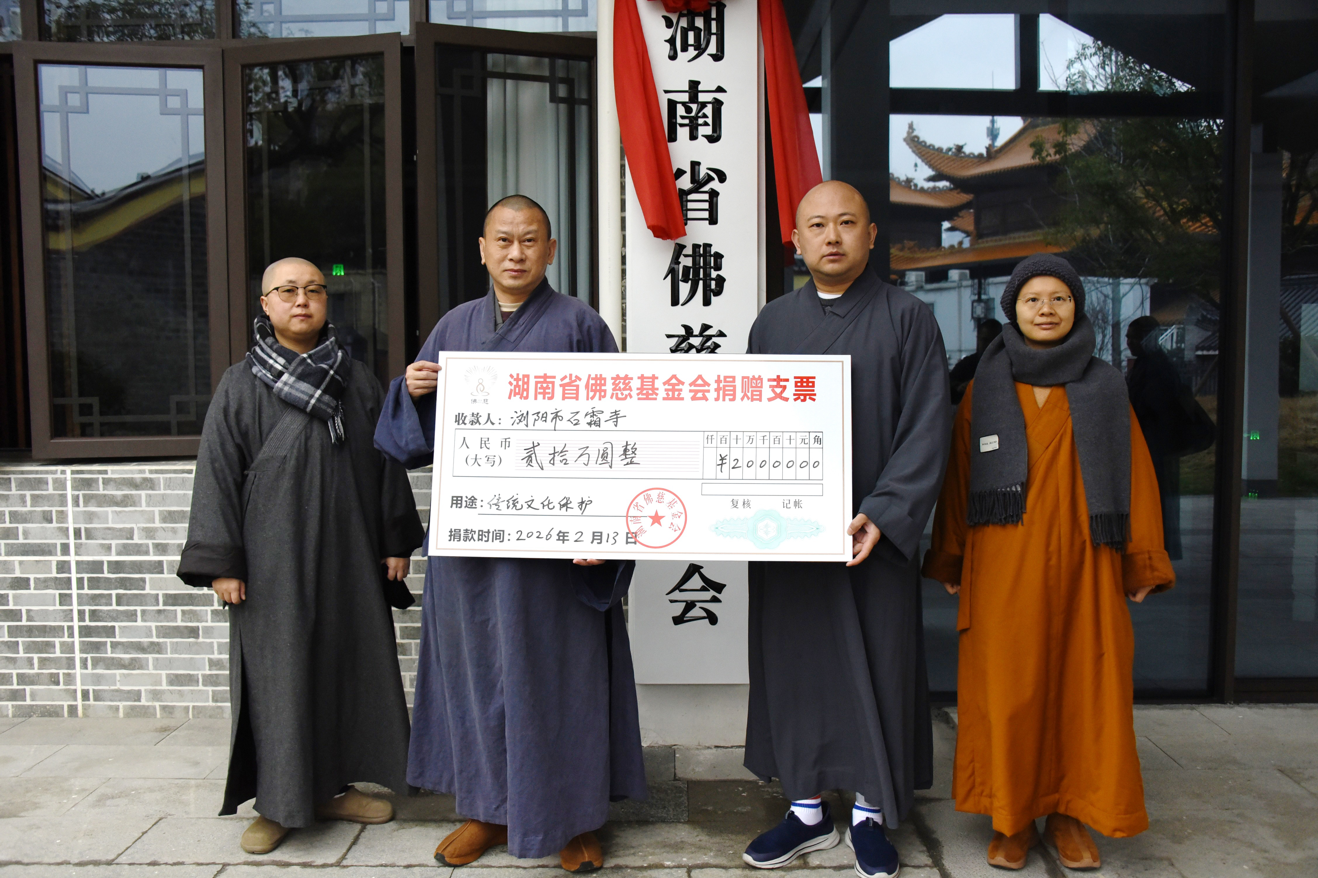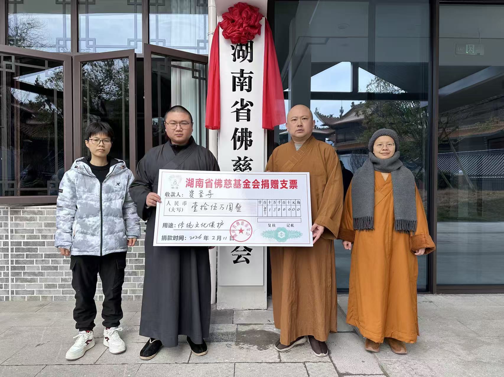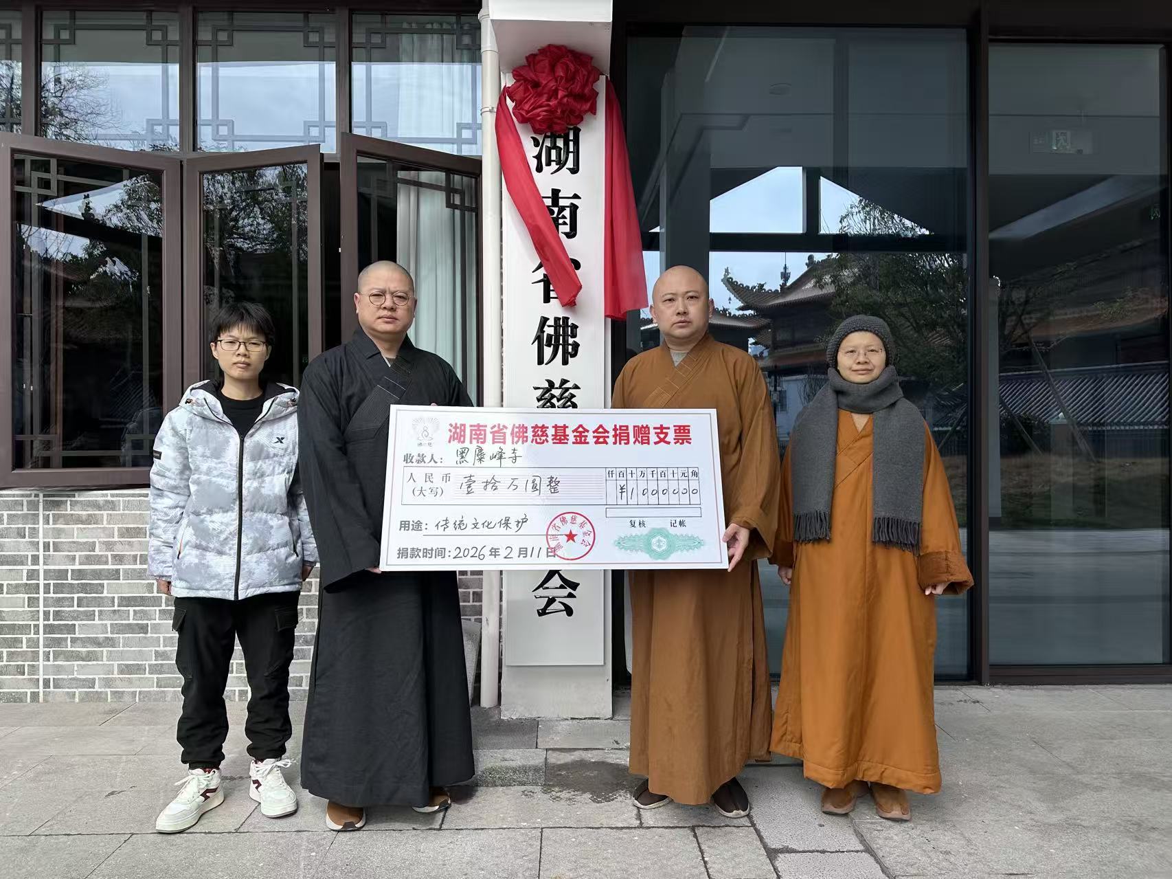 2026年2月11日至13日,受湖南省佛慈基金会理事长能净大和尚委托,基金会常务副理事长兼秘书长永兴大和尚代表基金会,向长沙黑麋峰寺、汨罗资圣寺、浏阳石霜寺、长沙县观音寺、长沙县九溪寺等五座寺院捐赠善款共计115 万元,专项用于寺院传统文化保护项目。